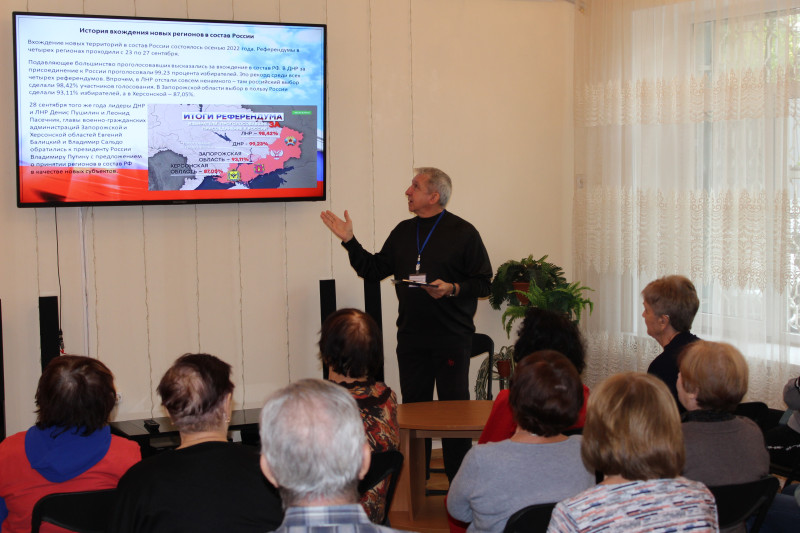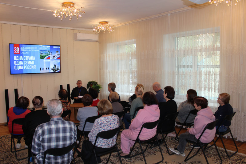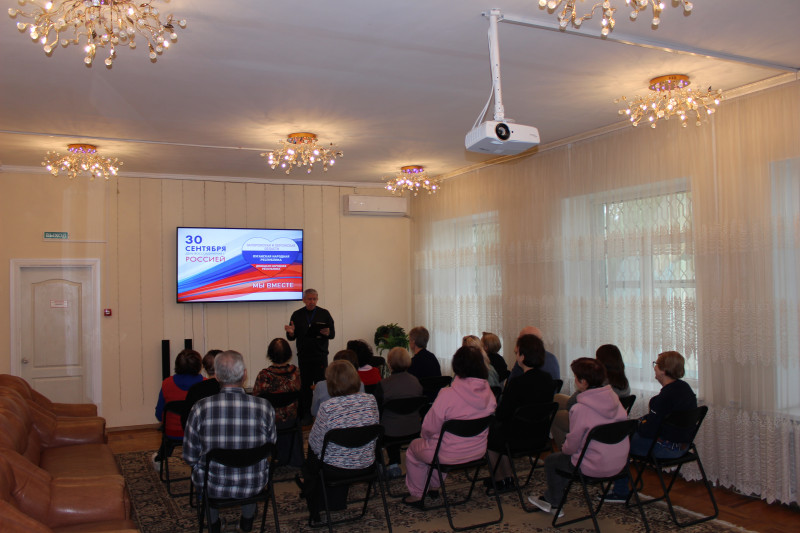 В МБУ «ЦСОН Октябрьского района г. Ростова-на-Дону» прошёл информационный час под названием «Мы - вместе!», посвящённый важной дате - Дню воссоединения Донецкой Народной Республики, Луганской Народной Республики, Запорожской и Херсонской областей с Российской Федерацией.