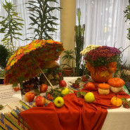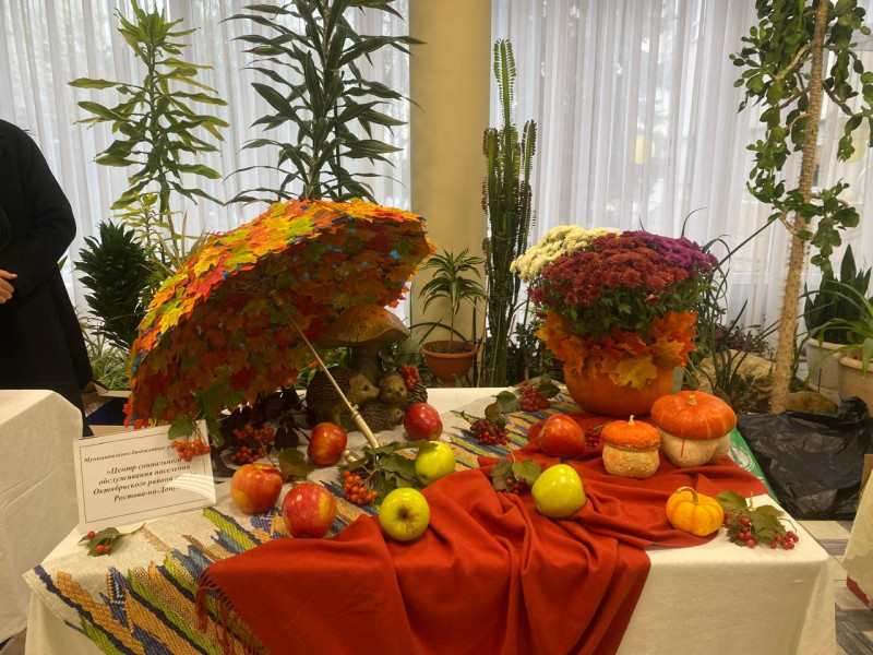 В зоне отдыха и общения Центр социального обслуживания населения Октябрьского района г.Ростова-на-Дону представил композицию, изготовленную из ярких даров осени и отражающую разноцветный калейдоскоп осенних красок.