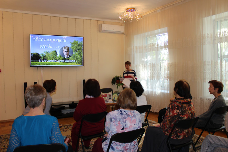 В рамках проекта "Время активных" в МБУ "ЦСОН Октябрьского района г. Ростова-на-Дону" проведена поэтическая программа - "Есенинские чтения", посвященные 130-летию со дня рождения великого русского поэта Серебряного века Сергея Александровича Есенина. Мероприятие стало результатом плодотворного сотрудничества участников литературной гостиной Центра и сотрудников библиотеки имени А.И. Куприна.