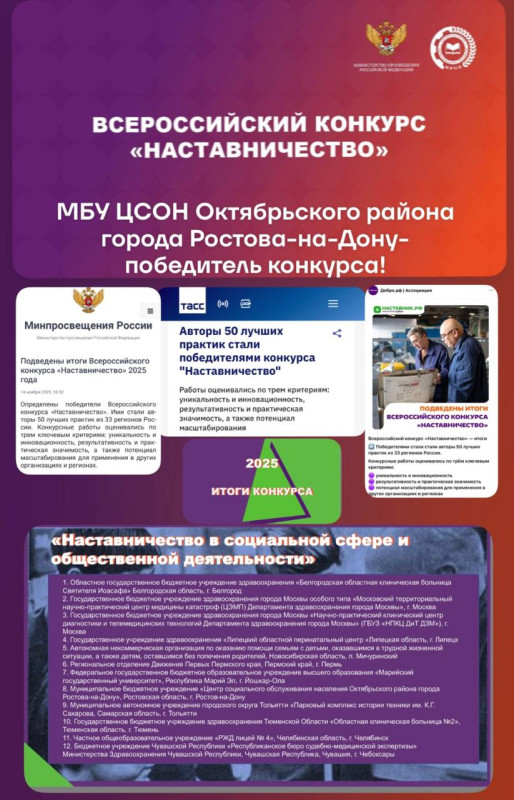 В ноябре текущего года подведены итоги Всероссийского конкурса «Наставничество-2025». В конкурсе приняло участие свыше 10 тысяч человек из 89 субъектов РФ. Были выбраны 50 лучших практик из 33 регионов. Центр социального обслуживания населения Октябрьского района города Ростова-на-Дону стал призером в номинации "Наставничество в социальной сфере и общественной деятельности". Практика будут размещена на платформе наставник.рф.