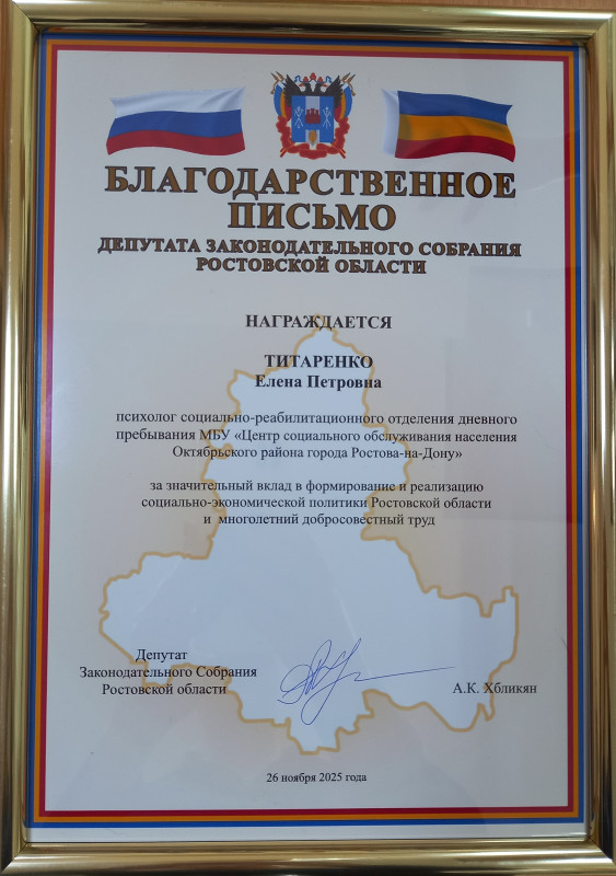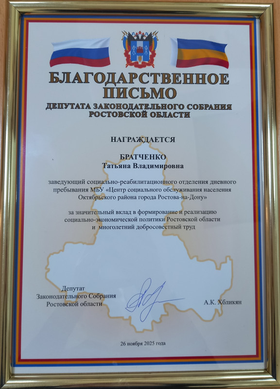26 ноября 2025 года состоялась конференции Октябрьского районного местного отделения партии "ЕДИНАЯ РОССИЯ". Депутат Законодательного Собрания Ростовской области Ашот Кеворкович Хбликян отметил заслуги сотрудников МБУ "ЦСОН Октябрьского района г. Ростова-на-Дону".