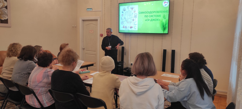 В рамках проекта «Время активных» сегодня в МБУ «ЦСОН Октябрьского района г. Ростова-на-Дону» состоялось очередное открытое занятие для получателей социальных услуг и жителей района по теме: «Система самооздоровления Су-Джок».